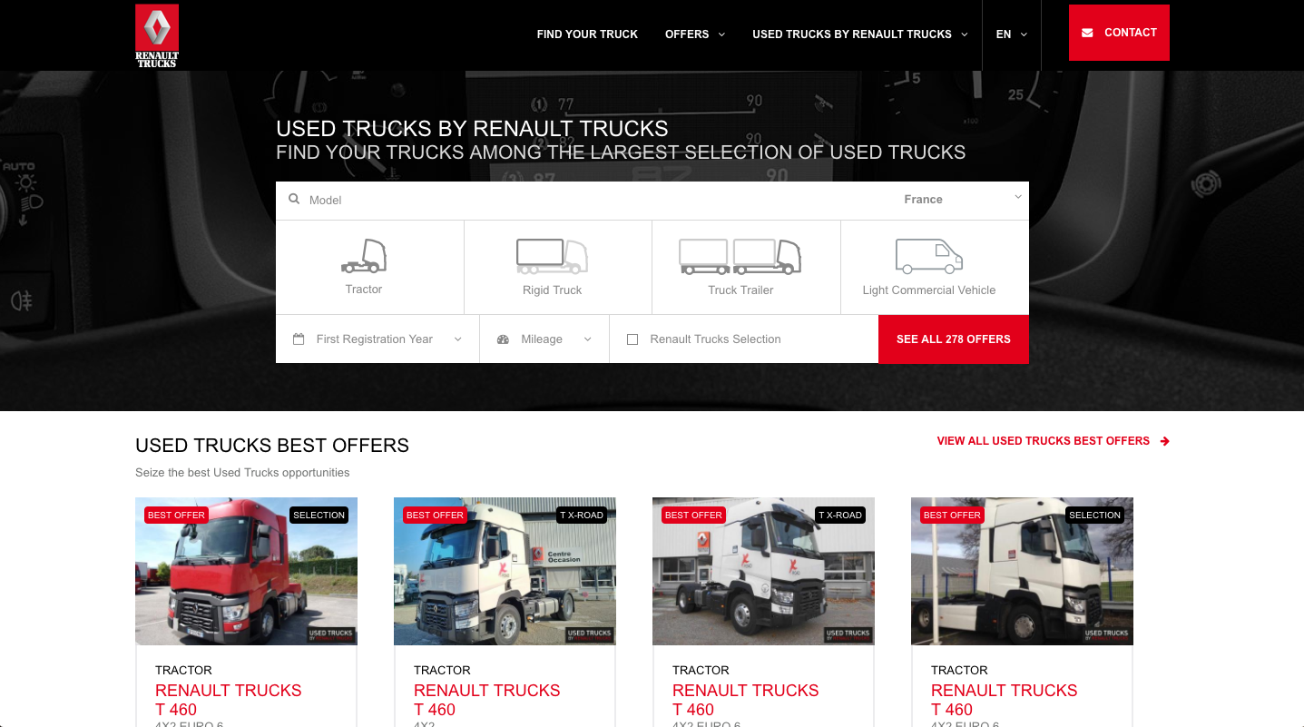 Renault Trucks propose désormais à ses clients de se connecter à www.used-renault-trucks.com, une plateforme en ligne permettant d’accéder au catalogue de camions d’occasion de la marque. Cet outil permet aux transporteurs de sélectionner leur futur camion d’occasion Renault Trucks selon des critères prédéfinis : configuration du véhicule, tarif, ou encore kilométrage. Chaque camion est présenté avec une fiche produit et géo-localisé avec les coordonnées du point de vente Renault Trucks dans lequel le véhicule est disponible.