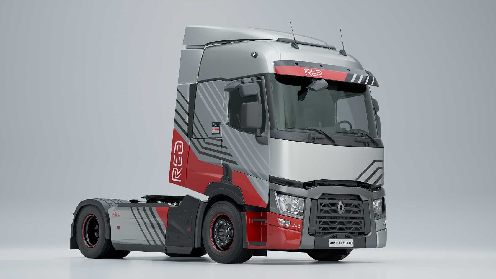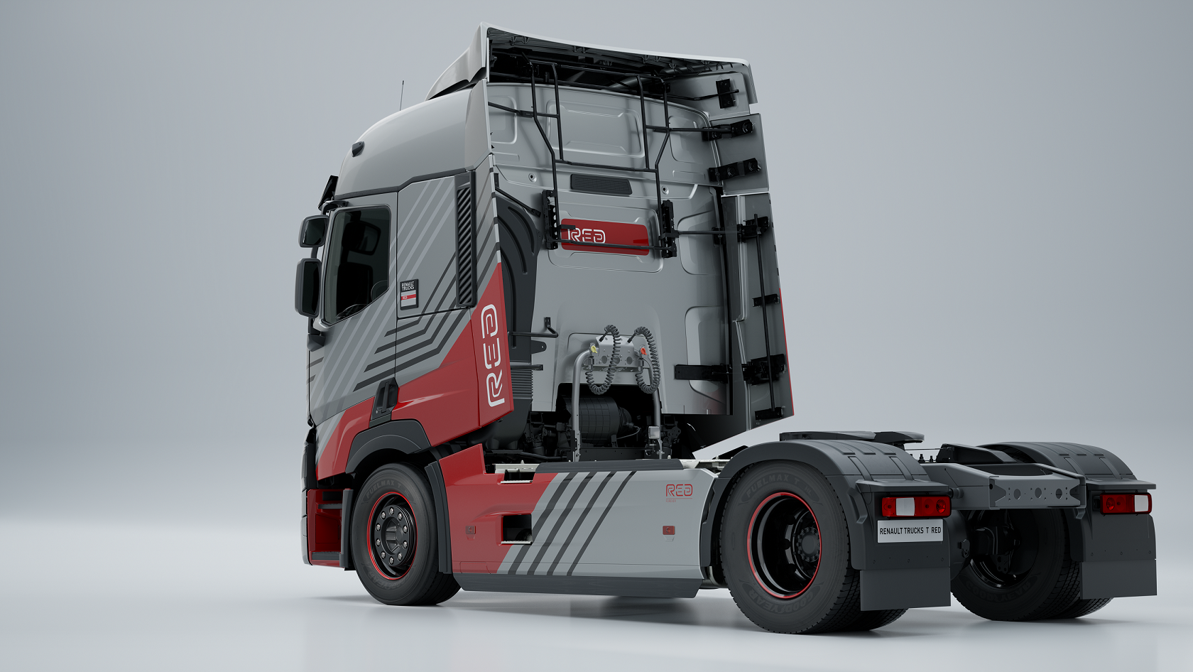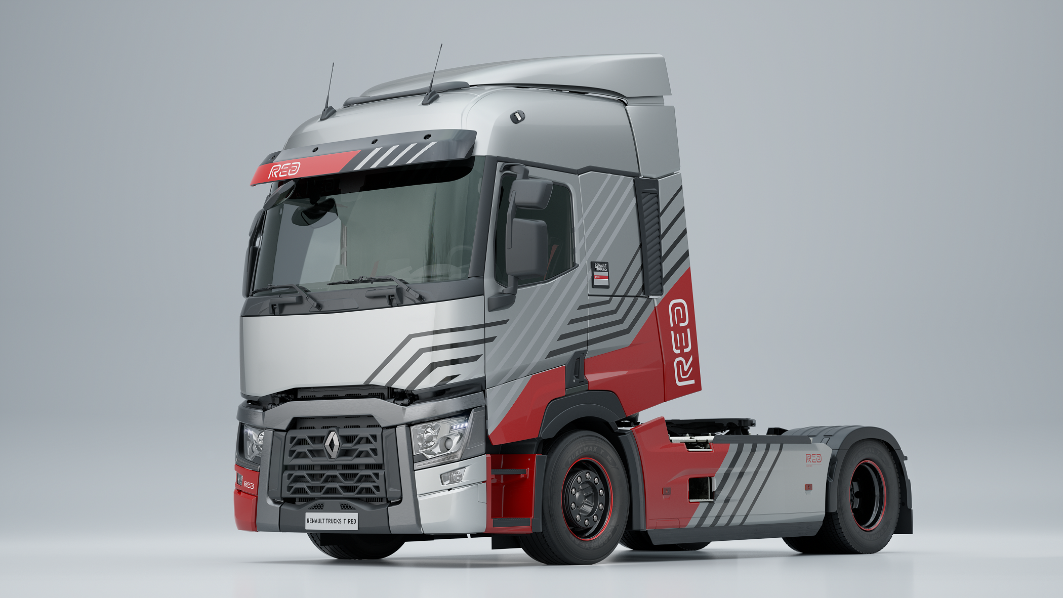 La carrosserie arbore un dégradé de gris et la couleur rouge, caractéristique de la marque au losange. Les designers ont travaillé un design asymétrique et ont habillé les flancs du véhicule de lignes graphiques dynamiques symbolisant le nouveau logo de Renault Trucks.