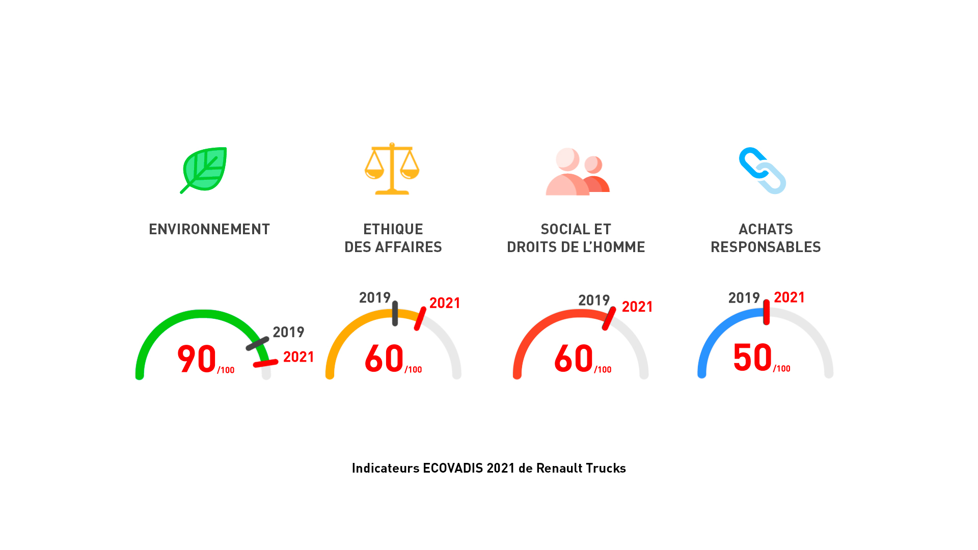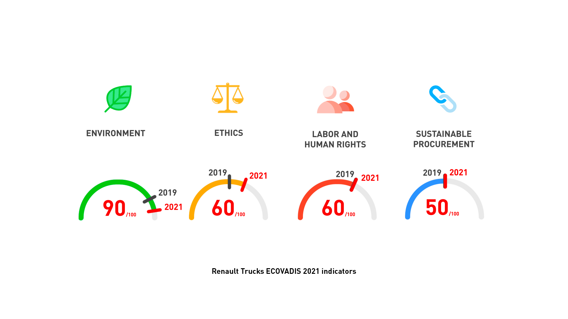 Pour la troisième année consécutive, Renault Trucks atteint le niveau « Gold », décerné par l’organisme indépendant Ecovadis pour son engagement RSE. Ecovadis a évalué 75 000 entreprises internationales, selon 21 critères répartis en quatre catégories : Social et Droits de l’Homme, Achats responsables, Éthique des affaires et Environnement. De nombreuses actions menées par Renault Trucks lui ont permis de réussir cet audit, notamment dans les deux dernières catégories.